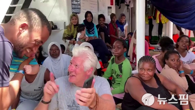 | [지중해 로이터=뉴스핌] 김근철 기자=미국 배우 리처드 기어(가운데)가 9일(현지시간) 지중해 상의 난민구조선 오픈 암스(Open Arms)호에서 구조된 난민들과 얘기를 나누고 있다. 2019.08.09. |