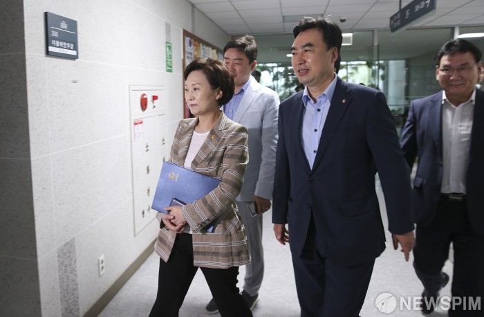[서울=뉴스핌] 이형석 기자 = 김현미 국토교통부 장관이 12일 오전 서울 여의도 국회에서 열린 당정협의회에 참석하고 있다. 이날 김 장관은 분양가 상한제를 민간택지에 확대 적용하는 방안을 발표할 예정이다. 2019.08.12 leehs@newspim.com