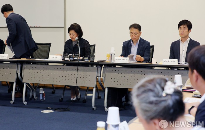 [서울=뉴스핌] 백인혁 기자 = 박영선 중소벤처기업부 장관(왼쪽 두번째)이 13일 오후 서울 중구 대한상공회의소에서 열린 '분업적 협력 생태계 조성을 위한 대·중소기업 간담회'에 참석해 자료를 살펴보고 있다. 2019.08.13 dlsgur9757@newspim.com