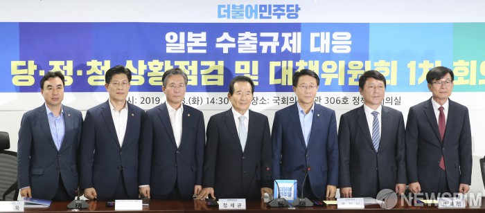 [서울=뉴스핌] 이형석 기자 = 13일 오후 서울 여의도 국회 의원회관에서 열린 일본 수출규제 대응 당‧정‧청 상황정검 및 대책위원회 1차 회의에서 참석자들이 기념촬영을 하고 있다. 왼쪽부터 윤관석 정책위수석부의장, 노형욱 국무조정실장, 성윤모 산업통상자원부 장관, 정세균 대책위원장, 조정식 정책위의장 최재성 일본경제침략대책특위 위원장, 김상조 청와대 정책실장. 2019.08.13 leehs@newspim.com