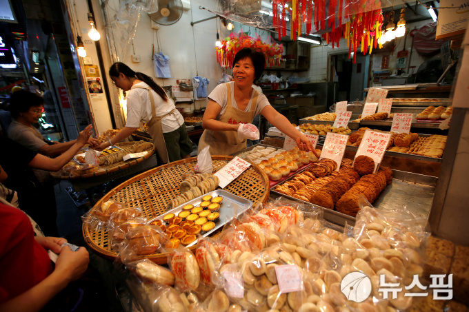 | [홍콩 로이터=뉴스핌] 전솔희 인턴기자 = 홍콩의 전통시장에 있는 한 빵집 주인이 손님을 반기고 있다. 2019.08.19. |