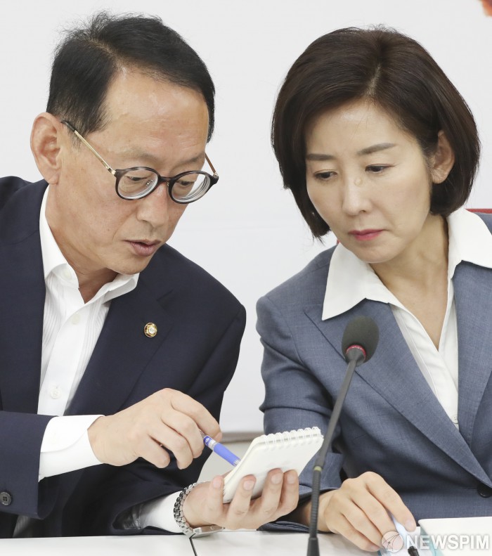 [서울=뉴스핌] 이형석 기자 = 나경원 자유한국당 원내대표와 김도읍 의원이 21일 오전 서울 여의도 국회에서 열린 조국 인사청문회 대책TF 2차회의에서 대화를 나누고 있다. 2019.08.21 leehs@newspim.com