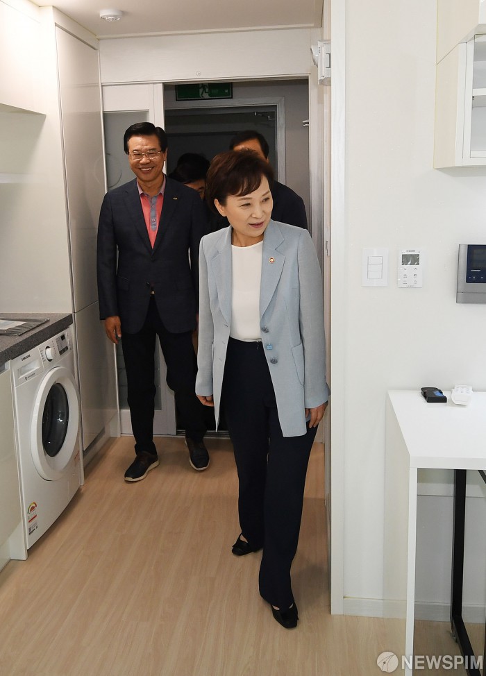 [서울=뉴스핌] 윤창빈 기자 = 김현미 국토부장관을 비롯한 서울시 구청장들이 21일 오전 서울 서대문구 소재 청년주택을 방문해 주택 내부를 둘러보고 있다. 2019.08.21 pangbin@newspim.com
