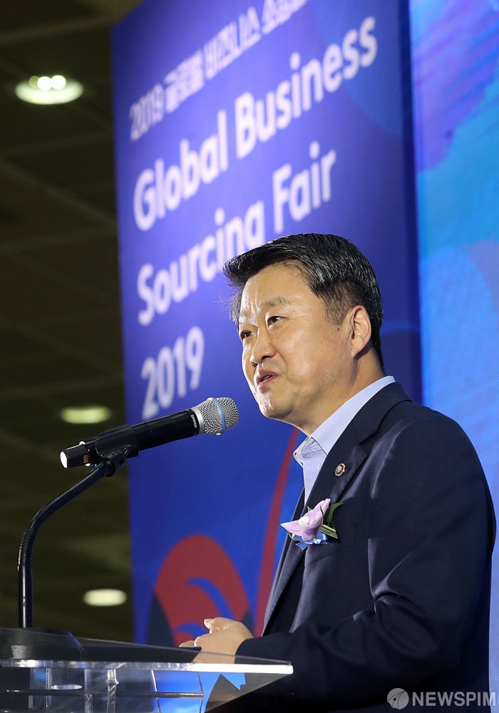 [서울=뉴스핌] 정일구 기자 = 김학도 중소벤처기업부 차관이 21일 오전 서울 강남구 코엑스에서 열린 '2019 글로벌 비즈니스 소싱페어' 개막식에서 축사를 하고 있다. 2019.08.21 mironj19@newspim.com
