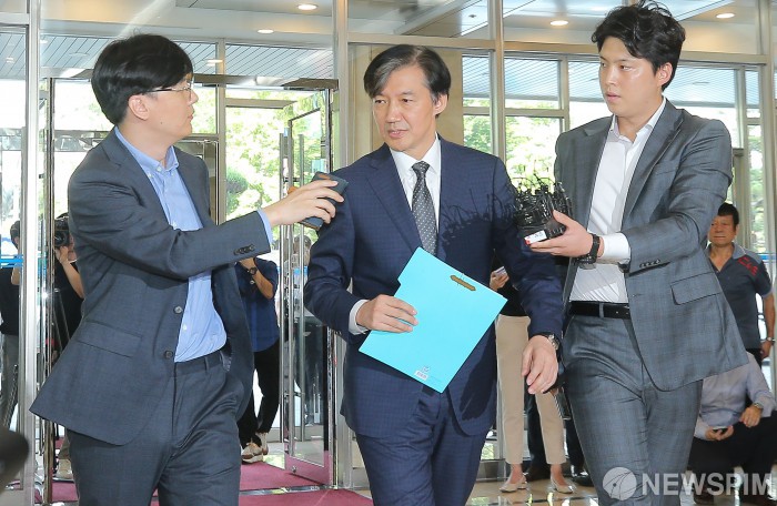 [서울=뉴스핌] 윤창빈 기자 = 조국 법무부 장관 후보자가 22일 오전 서울 종로구 적선현대빌딩에 위치한 사무실로 취재진의 질문을 받으며 출근을 하고 있다. 2019.08.22 pangbin@newspim.com