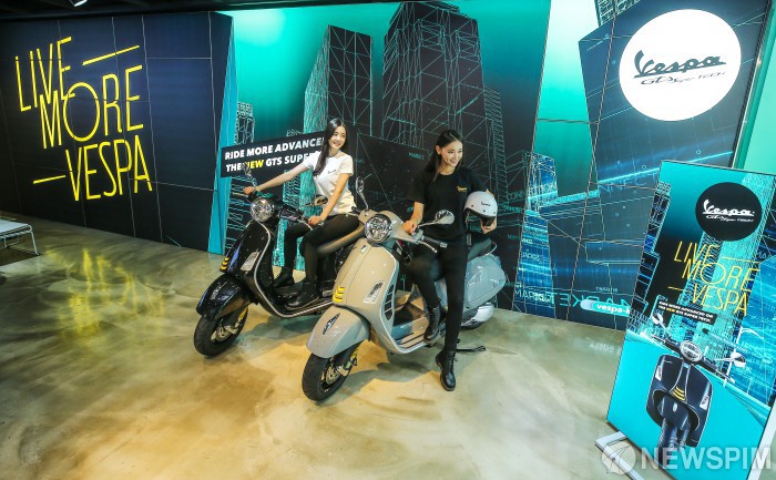 [서울=뉴스핌] 윤창빈 기자 = 23일 오전 서울 강남구 베스파 라운지에서 열린 베스파 GTS SuperTech 미디어 행사에서 모델들이 포즈를 취하고 있다. 16년만에 풀체인지 된 베스파 GTS SuperTech는 GTS역사상 가장 강력한 엔진으로 기존 출력보다 12%, 토크는 18%나 증가되었다. 컬러는 네로 불카노(블랙컬러), 그레이 아비오(회색 컬러) 2가지로 구성 되어있다. 2019.08.23 pangbin@newspim.com