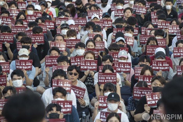 [서울=뉴스핌] 백인혁 기자 = 23일 오후 서울 성북구 고려대학교 중앙광장에서 고려대학교 학생들이 조국 법무부 장관 후보자 딸의 고려대 입학과정에 대한 진상규명 촉구 촛불 집회를 하고 있다. 2019.08.23 dlsgur9757@newspim.com