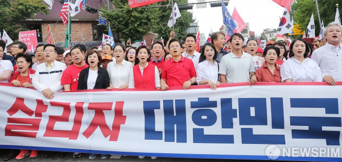 [서울=뉴스핌] 윤창빈 기자 = 나경원 자유한국당 원내대표(왼쪽 여섯번째부터), 황교안 자유한국당 대표와 참석자들이 24일 오후 서울 종로구 광화문광장에서 열린 ‘살리자 대한민국! 文정권 규탄 광화문 집회’에서 행진 도중 구호를 외치고 있다. 2019.08.24 pangbin@newspim.com
