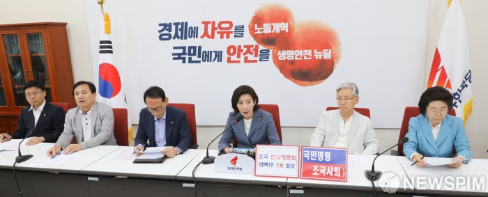 [서울=뉴스핌] 최상수 기자 = 나경원 자유한국당 원내대표가 27일 오전 서울 여의도 국회에서 열린 조국 인사청문회 대책TF 7차회의에서 발언하고 있다. 2019.08.27 kilroy023@newspim.com