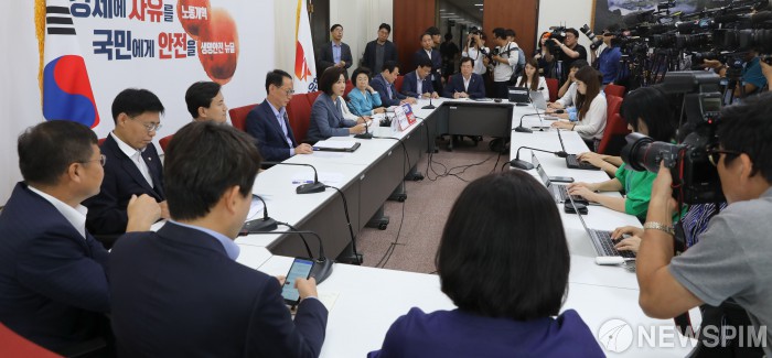 [서울=뉴스핌] 최상수 기자 = 나경원 자유한국당 원내대표가 27일 오전 서울 여의도 국회에서 열린 조국 인사청문회 대책TF 7차회의에서 발언하고 있다. 2019.08.27 kilroy023@newspim.com