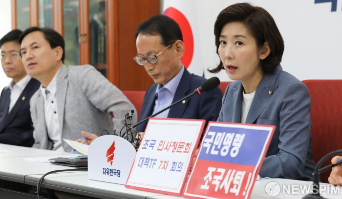 [서울=뉴스핌] 최상수 기자 = 나경원 자유한국당 원내대표가 27일 오전 서울 여의도 국회에서 열린 조국 인사청문회 대책TF 7차회의에서 발언하고 있다. 2019.08.27 kilroy023@newspim.com
