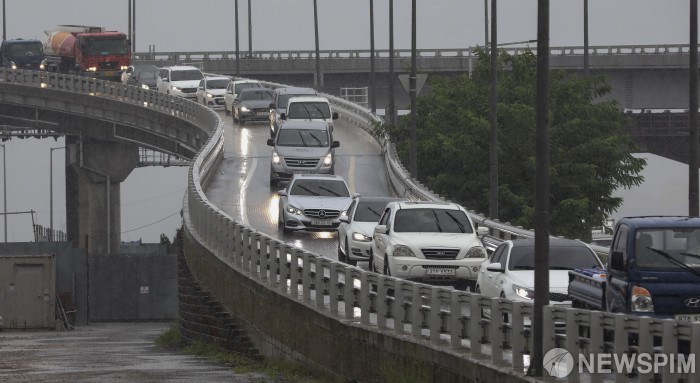 [서울=뉴스핌] 이한결 기자 = 29일 오전 서울 성동구 인근 도로에서 갑자기 내리는 폭우에 차량들이 서행하고 있다. 2019.08.29 alwaysame@newspim.com