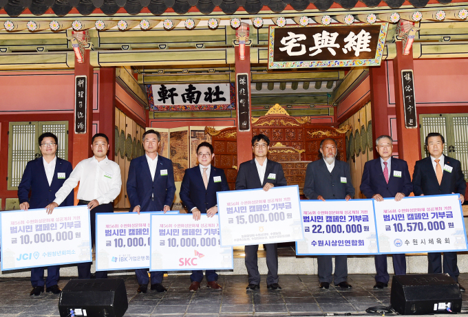 이날 회의 중 ㈜SKC(1000만 원), ㈜IBK 기업은행 동수원지점(1000만 원), JCI 수원청년회의소(1000만 원), 농협중앙회 수원시지부·수원농협·수원축산농협·수원원예농협·농협수원유통센터(1500만 원), 수원시체육회(1057만 원), 수원시상인연합회(2200만 원)가 수원화성문화제추진위원회에 기부금을 전달했다.