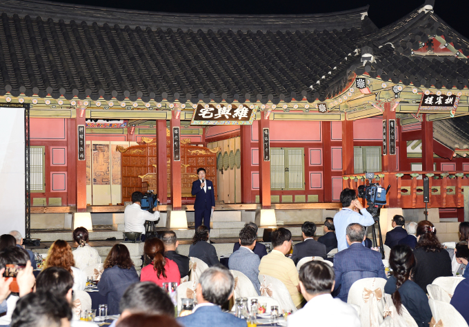 | 염태영 수원시장이 29일 화성행궁 유여택에서 제56회 수원화성문화제추진위원회 전체총회에서 인사말을 하고 있다. [사진=수원시] |