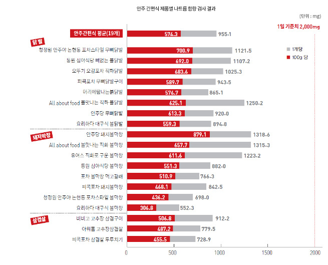 [서울=뉴스핌] 박효주 기자 = 최근 인기를 끌고 있는 안주 간편식 제품 평균 나트룸 함량이 1일 섭취 기준치의 절반에 가까운 것으로 나타났다.