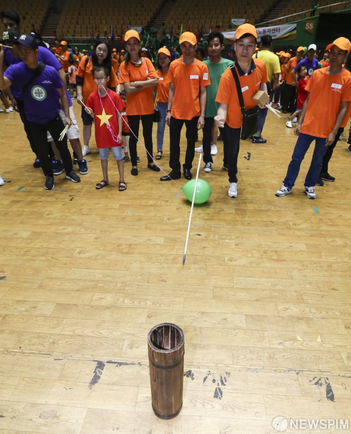 [서울=뉴스핌] 이한결 기자 = 1일 오후 서울 송파구 잠실종합운동장 실내체육관에서 성동외국인노동자센터 주관으로 열린 ‘제9회 서울시 외국인 노동자 체육대회’에서 외국인 노동자 가족들이 각종 놀이를 즐기고 있다. 2019.09.01 alwaysame@newspim.com
