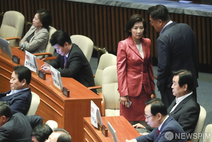 [서울=뉴스핌] 이형석 기자 = 나경원 자유한국당 원내대표가 2일 오후 서울 여의도 국회에서 열린 제371회 국회 개회식에서 정진석 의원과 대화를 나누고 있다. 2019.09.02 leehs@newspim.com