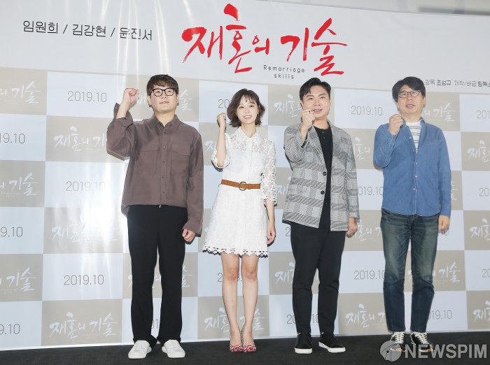 [서울=뉴스핌] 윤창빈 기자 = 배우 김강현,박해빛나,임원희,조성규 감독이 3일 오전 서울 용산구 CGV용산아이파크몰점에서 열린 영화 ‘재혼의 기술’ 제작보고회에서 포토타임을 가지고 있다. 영화 ‘재혼의 기술’은 결혼에 실패한 한 남자가 운명적인 사랑을 만나 재혼에 도전하게 되며 벌어지는 이야기를 그린 로맨틱 코미디 영화이다. 2019.09.03 pangbin@newspim.com