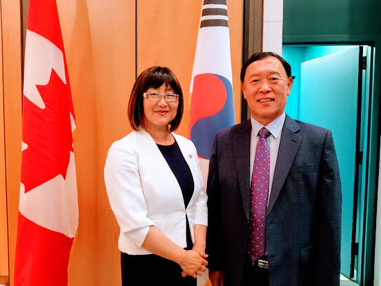 | 김성기(오른쪽) 가평군수와 캐나다연방의회 연아 마틴 상원의원이 기념촬영하고 있다.[사진=가평군] |