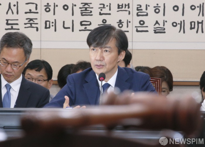 [서울=뉴스핌] 이형석 기자 = 조국 법무부장관 후보자가 6일 오전 서울 여의도 국회 법제사법위원회에서 열린 법무부장관 후보자 인사청문회에 출석해 의원들의 질의에 답하고 있다. 2019.09.06 leehs@newspim.com