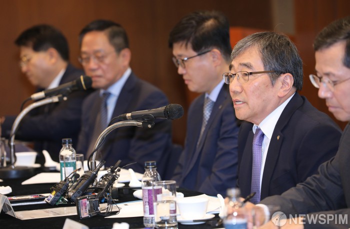 [서울=뉴스핌] 백인혁 기자 = 윤석헌 금융감독원장(왼쪽 네번째)이 6일 오후 서울 중구 은행회관에서 열린 신용카드사 CEO 오찬 간담회에서 모두발언을 하고 있다. 2019.09.06 dlsgur9757@newspim.com