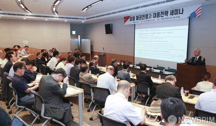 [서울=뉴스핌] 이형석 기자 = 서진교 KIEP 무역혁정팀 선임연구위원이 9일 오후 서울 여의도 전경련 컨퍼런스센터에서 열린 '미중 패권전쟁과 대응전략 세미나'에서 주제발표를 하고 있다. 2019.09.09 leehs@newspim.com