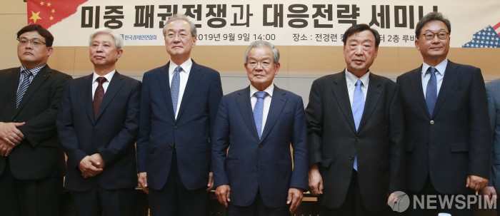 [서울=뉴스핌] 이형석 기자 = 권태신 전국경제인연합회 상근부회장(왼쪽 네 번째)을 비롯한 내빈들이 9일 오후 서울 여의도 전경련 컨퍼런스센터에서 열린 '미중 패권전쟁과 대응전략 세미나'에서 기념촬영을 하고 있다. 2019.09.09 leehs@newspim.com