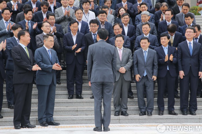 [과천=뉴스핌] 윤창빈 기자 = 박상기 법무부 장관이 9일 오후 경기 과천시 정부과천청사에서 열린 제65대 박상기 법무부장관 이임식을 마치고 직원들과 마지막 인사를 나누고 있다. 2019.09.09 pangbin@newspim.com