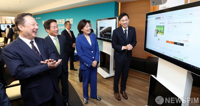 [서울=뉴스핌] 정일구 기자 = 박영선 중소벤처기업부 장관과 박용만 대한상공회의소 회장 등 참석자들이 16일 오전 서울 중구대한상의에서 열린 중소기업 복지플랫폼 오픈 기념행사에서 복지플랫폼을 시연하고 있다. 2019.09.16 mironj19@newspim.com