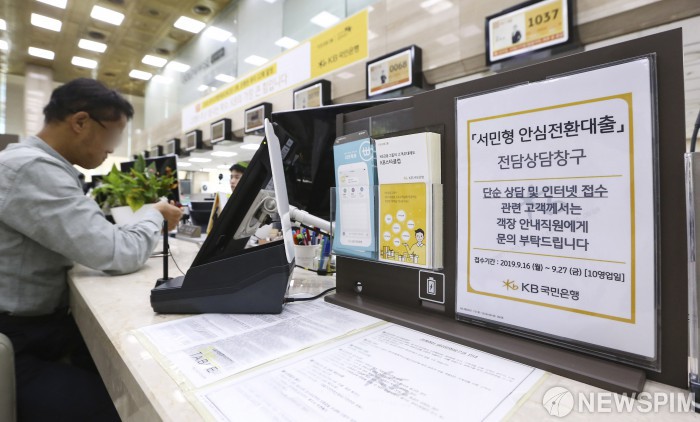 [서울=뉴스핌] 이한결 기자 = 16일 오후 서울 여의도 KB국민은행 본점에서 ‘서민형 안심전환대출’ 전담상담창구가 열려 고객들이 이용하고 있다. ‘서민형 안심전환대출’ 전담상담창구는 오늘부터 27일 금요일까지 접수할 수 있으며 온라인 접수는 29일까지 신청할수 있다. 2019.09.16 alwaysame@newspim.com