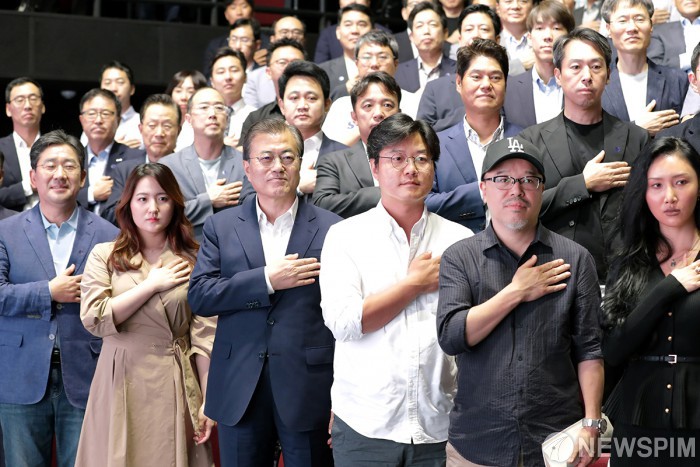 [서울=뉴스핌] 문재인 대통령이 17일 오후 서울 동대문구 콘텐츠인재캠퍼스에서 열린 콘텐츠산업 3대 혁신전략 발표회에서 참석자들과 함께 국기에 경례하고 있다. [사진=청와대] 2019.09.16 photo@newspim.com