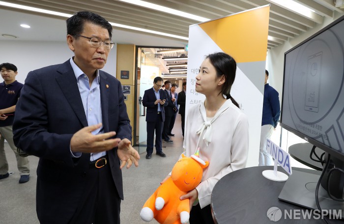 [서울=뉴스핌] 정일구 기자 = 은성수 금융위원장이 18일 오전 서울 강남구 디캠프에서 열린 '핀테크 스케일업(Scale-up) 현장간담회'에서 핀테크업계 관계자와 소통을 하고 있다. 2019.09.18 mironj19@newspim.com