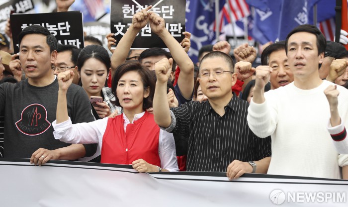 [서울=뉴스핌] 이한결 기자 = 황교안 자유한국당 대표와 나경원 원내대표가 21일 오후 서울 종로구 세종문화회관 앞에서 열린 ‘문재인정권 헌정유린 중단과 위선자 조국 파면 촉구 광화문 집회’에서 자유한국당 지지자들과 함께 청와대 쪽으로 가두행진을 하며 구호를 외치고 있다. 2019.09.21 alwaysame@newspim.com