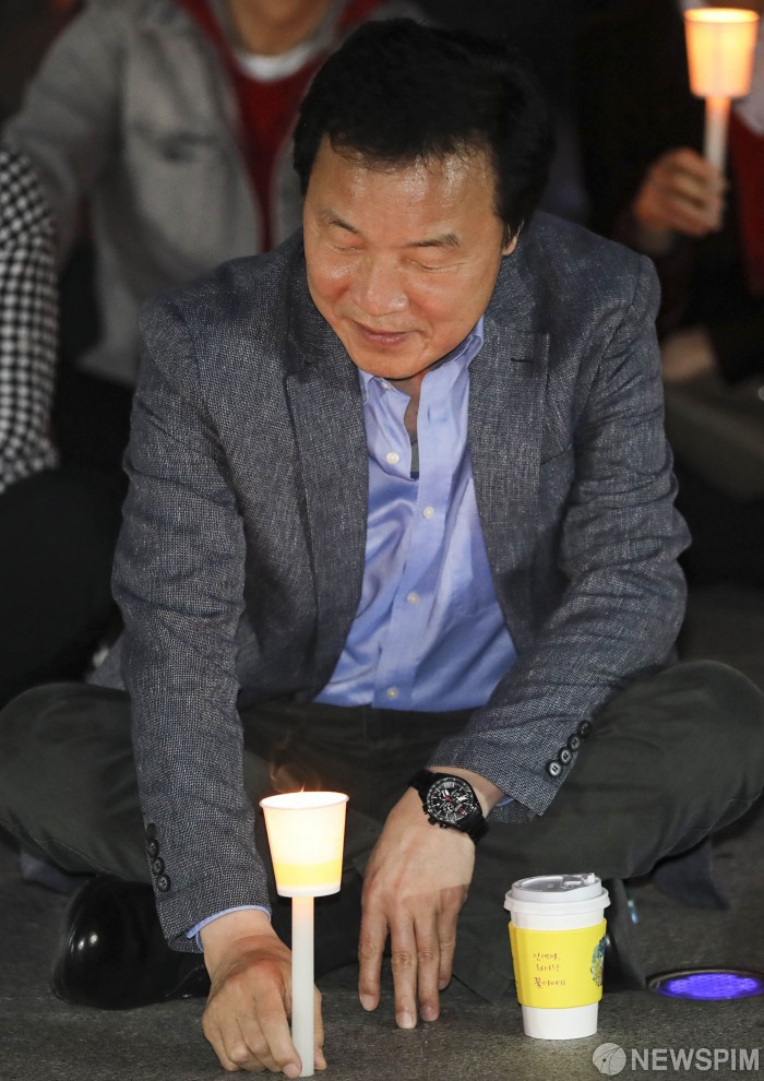 [서울=뉴스핌] 이한결 기자 = 손학규 바른미래당 대표가 21일 오후 서울 종로구 광화문광장에서 열린 ‘조국 법무부장관 임명 철회 촉구 촛불집회’에서 촛불을 들고 있다. 2019.09.21 alwaysame@newspim.com