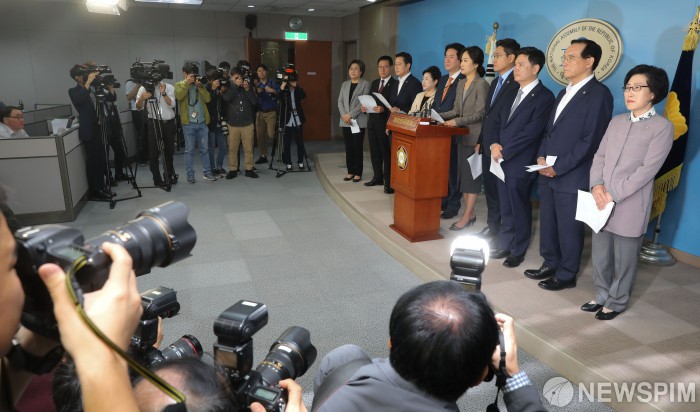 [서울=뉴스핌] 최상수 기자 = 오신환 바른미래당 원내대표를 비롯한 의원들이 24일 오전 서울 여의도 국회 정론관에서 하태경 최고위원 징계 관련 기자회견을 열고 있다. 2019.09.24 kilroy023@newspim.com