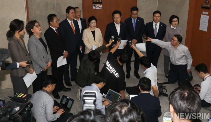 [서울=뉴스핌] 최상수 기자 = 오신환 바른미래당 원내대표를 비롯한 의원들이 24일 오전 서울 여의도 국회 정론관에서 열린 하태경 최고위원 징계 관련 기자회견을 마친 뒤 취재진의 질문에 답변하고 있다. 2019.09.24 kilroy023@newspim.com
