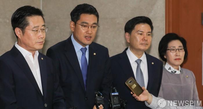 [서울=뉴스핌] 최상수 기자 = 오신환 바른미래당 원내대표를 비롯한 의원들이 24일 오전 서울 여의도 국회 정론관에서 열린 하태경 최고위원 징계 관련 기자회견을 마친 뒤 취재진의 질문에 답변하고 있다. 2019.09.24 kilroy023@newspim.com