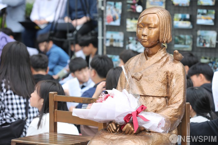 [서울=뉴스핌] 백인혁 기자 = 25일 오후 서울 종로구 옛 일본대사관 앞에서 열린 제1406차 정기 수요 집회에서 소녀상 위에 꽃이 놓여져 있다. 2019.09.25 dlsgur9757@newspim.com