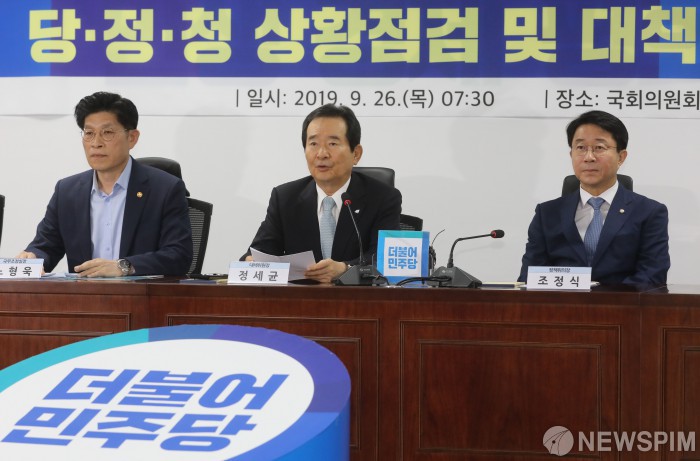 [서울=뉴스핌] 최상수 기자 = 26일 오전 서울 여의도 국회에서 열린 일본수출규제 대응 당정청 상황점검 및 대책위원회 3차 회의에서 정세균 위원장이 발언하고 있다. 2019.09.26 kilroy023@newspim.com