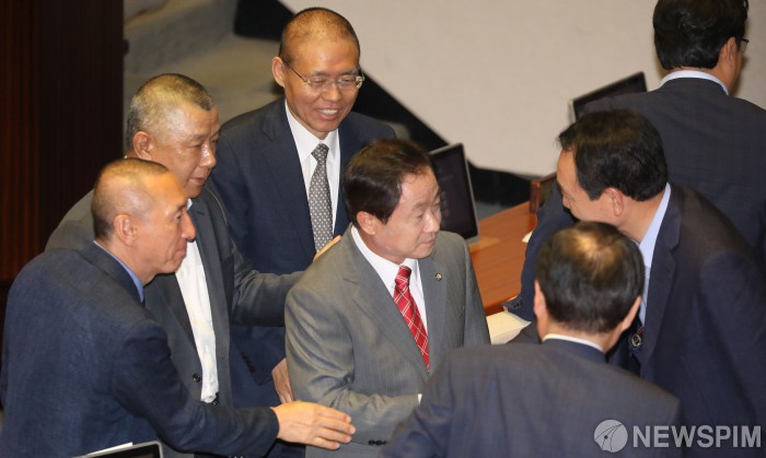[서울=뉴스핌] 최상수 기자 = 주광덕 자유한국당 의원이 26일 오후 서울 여의도 국회에서 열린 본회의에서 대정부질문을 마친 뒤 동료 의원들에게 격려를 받고 있다. 2019.09.26 kilroy023@newspim.com