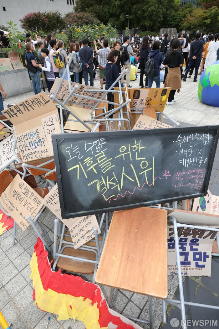 [서울=뉴스핌] 백인혁 기자 = 27일 오전 서울 종로구 세종로공원에서 청소년 기후 행동 소속 학생들이 기후를 위한 결석시위를 하고 있다. 2019.09.27 dlsgur9757@newspim.com