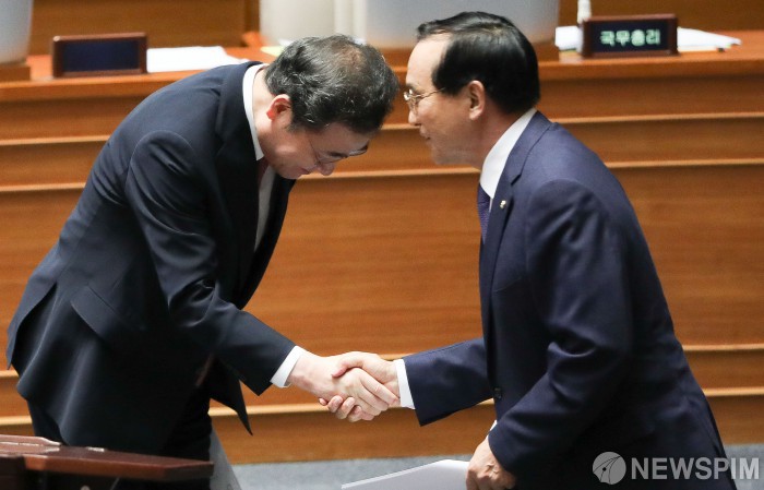 [서울=뉴스핌] 최상수 기자 = 이낙연 국무총리가 27일 오후 서울 여의도 국회에서 열린 본회의 대정부질문에서 김중로 바른미래당 의원의 질의가 끝난 뒤 악수를 나누고 있다. 2019.09.27 kilroy023@newspim.com
