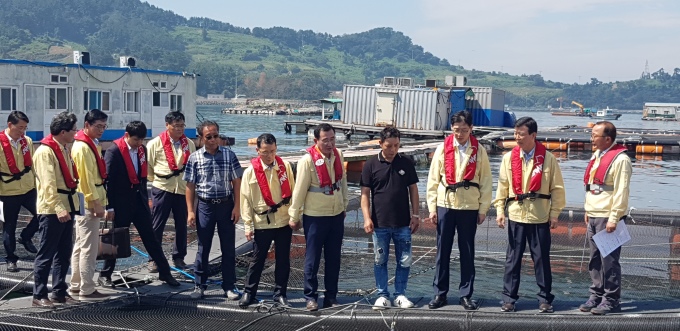 | 김경수 경남도지사(오른쪽 세 번째)가 적조가 발생한 남해 해역에 피해 현황을 살펴보고 있다.[사진=경남도청]2019.9.30. |