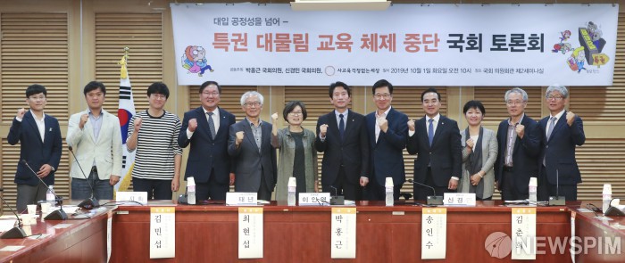 [서울=뉴스핌] 이형석 기자 = 이인영 더불어민주당 원내대표를 비롯한 참석자들이 1일 오전 서울 여의도 국회 의원회관에서 열린 특권 대물림 교육 체제 중단 국회 토론회에서 기념촬영을 하고 있다. 2019.10.01 leehs@newspim.com