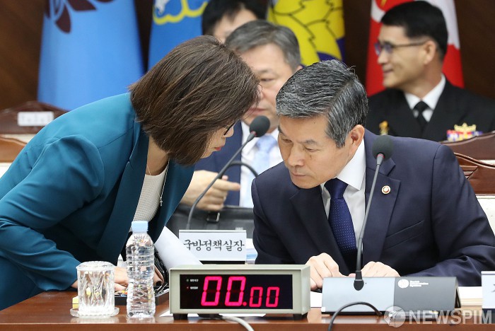 [서울=뉴스핌] 정일구 기자 = 정경두 국방부 장관(오른쪽)이 2일 오전 서울 용산구 국방부에서 열린 국회 국방위원회 국방부 국정감사에서 최현수 대변인과 대화를 하고 있다. 2019.10.02 mironj19@newspim.com
