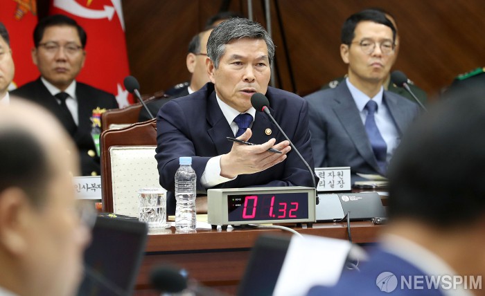 [서울=뉴스핌] 정일구 기자 = 정경두 국방부 장관이 2일 오전 서울 용산구 국방부에서 열린 국회 국방위원회 국방부 국정감사에서 위원들의 질문에 답하고 있다. 2019.10.02 mironj19@newspim.com