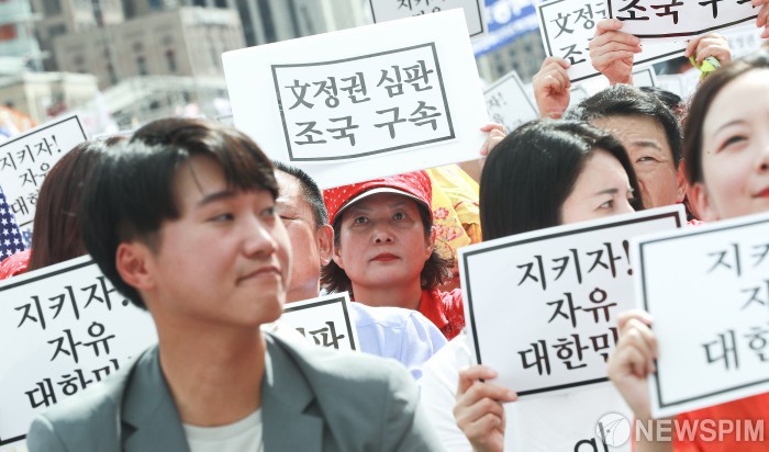 [서울=뉴스핌] 이형석 기자 = 3일 오후 서울 종로구 광화문광장에서 자유한국당의 문재인 정권의 헌정유린 중단과 위선자 조국 파면 촉구 광화문 규탄대회가 열리고 있다. 2019.10.03 leehs@newspim.com