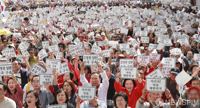 [서울=뉴스핌] 이형석 기자 = 3일 오후 서울 종로구 광화문광장에서 자유한국당의 문재인 정권의 헌정유린 중단과 위선자 조국 파면 촉구 광화문 규탄대회가 열리고 있다. 2019.10.03 leehs@newspim.com