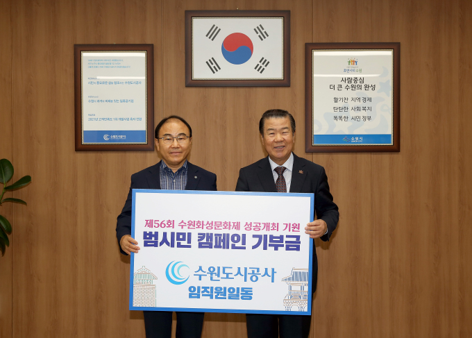 [수원=뉴스핌] 정은아 기자 = 이부영 수원도시공사 사장(사진 왼쪽)이 2일 오전 더함파크에서 수원지역 대표 축제인 제56회 수원화성문화제의 성공개최를 위해 김훈동 수원화성문화제추진위원회 위원장에게 기부금을 전달했다. jea0608@newspim.com