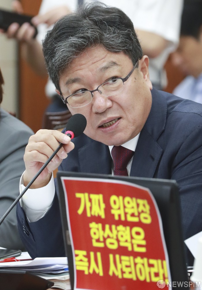 [서울=뉴스핌] 이형석 기자 = 윤상직 자유한국당 의원이 4일 오전 서울 여의도 국회 과학기술정보방송통신위원회에서 열린 방송통신위원회, 방송통신사무소, 방송통신심의위원회, 시청자미디어재단 국정감사에서 질의를 하고 있다. 2019.10.04 leehs@newspim.com
